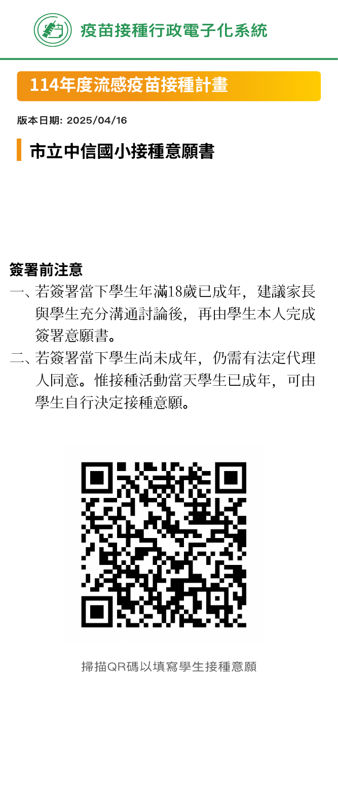 公告 中信國小「114/10/8(三)校園流感疫苗集中接種」通知