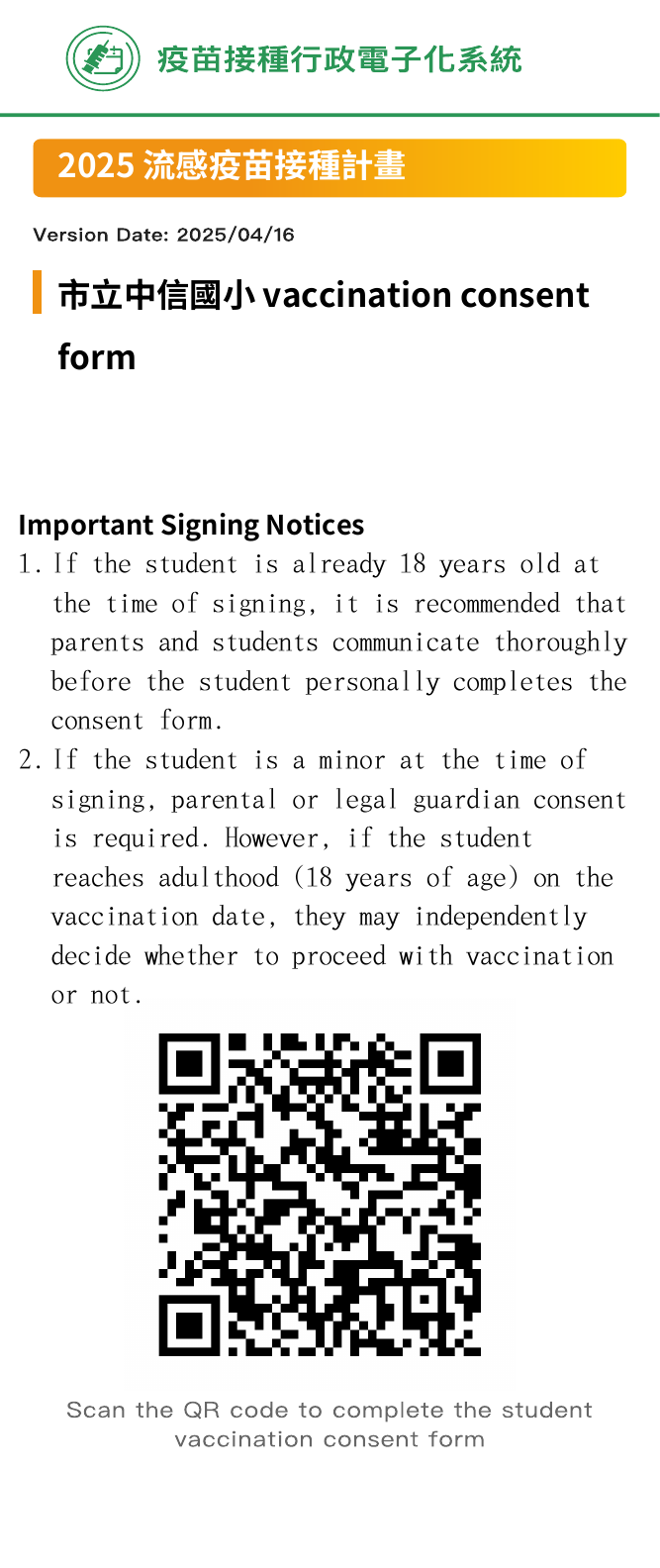 2. 簽署流程:掃描QR碼或網頁連結→輸入學生的身分證字號、生日→詳讀個資聲明及流感疫苗說明(必須拉到底部,才能勾選)→填寫家長基本資料及電郵→勾選學生接種意願→簽署家長中文全名→預覽簽署結果→完成簽署。